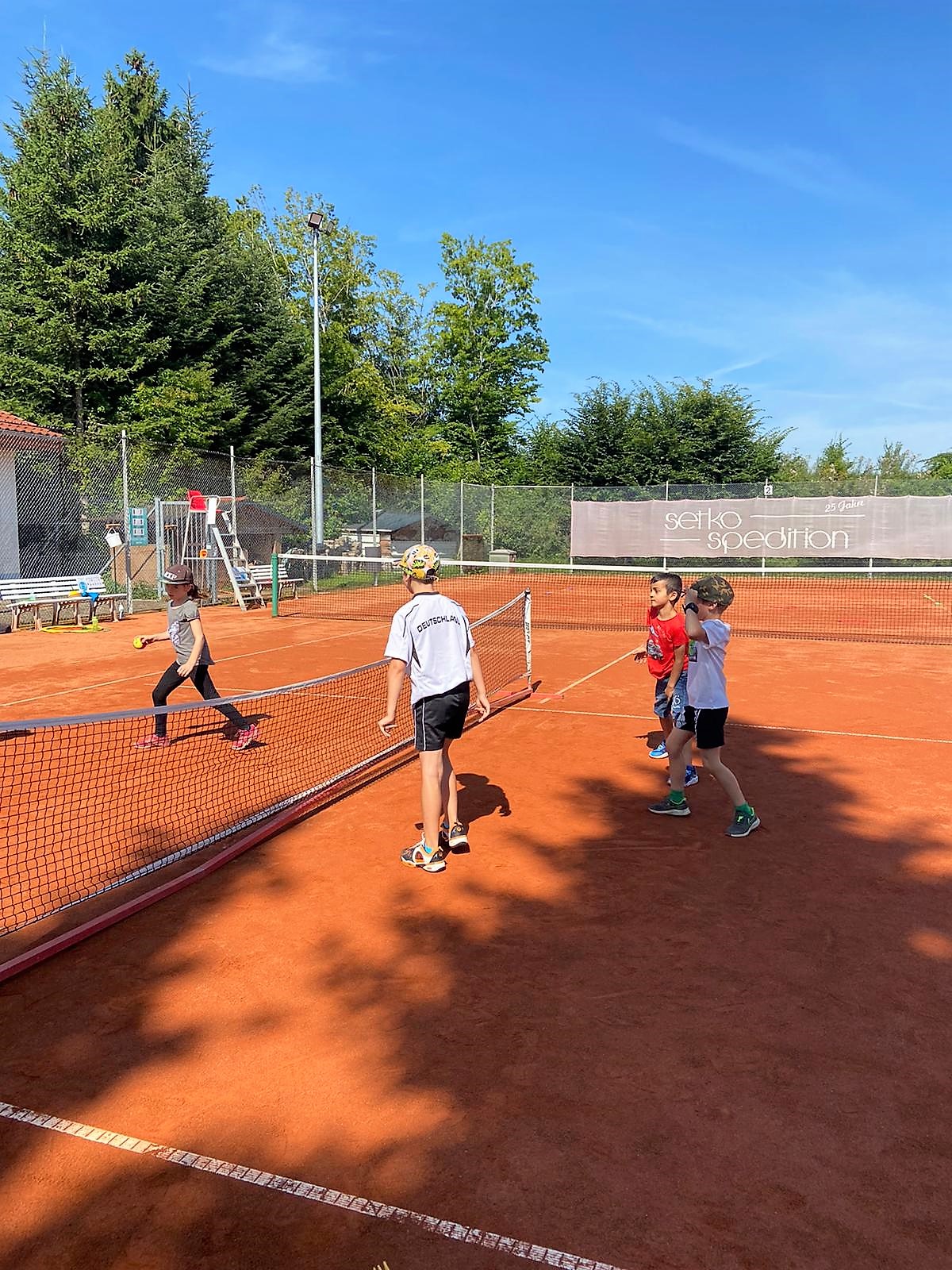 Organisiert und geleitet wurde das Ferienprogramm von Philipp Renz und Ilonka Bier mit Hilfe der Nachwuchskräfte Lea-Marie Wölfle und Sophia Kiefer. 12 Kinder wurden dem Alter nach in drei Gruppen aufgeteilt. Die kleinsten konnten ihr Talent bei lustigen Ballübungen über das kleine Netz ausprobieren. Dabei wurde viel gelacht und die Kids hatten sichtlich Spaß. Die Älteren, in zwei weitere Gruppen aufgeteilt, konnten schon ein paar Grundschlägen wie Vorhand, Rückhand, Volley und Aufschlag ausprobieren. Alle Kinder kamen gehörig ins Schwitzen und konnten sich danach unter den laufenden Wassersprenklern Abkühlung verschaffen. Zum Abschied gab es noch ein Eis.